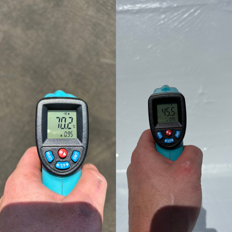 Warmte-afstotend: Onze witte daken weerkaatsen een groot deel van de zonnestralen dankzij het hoge albedo, waardoor ze veel minder warmte absorberen dan donkere daken, het is een aanzienlijke vermindering van 70°C naar 45°C! Ook is ons systeem Uv-werend dat zorgt voor nog meer weerkaatsing. Dit houdt het gehele gebouw koeler, wat leidt tot lagere koelingskosten in de zomermaanden.